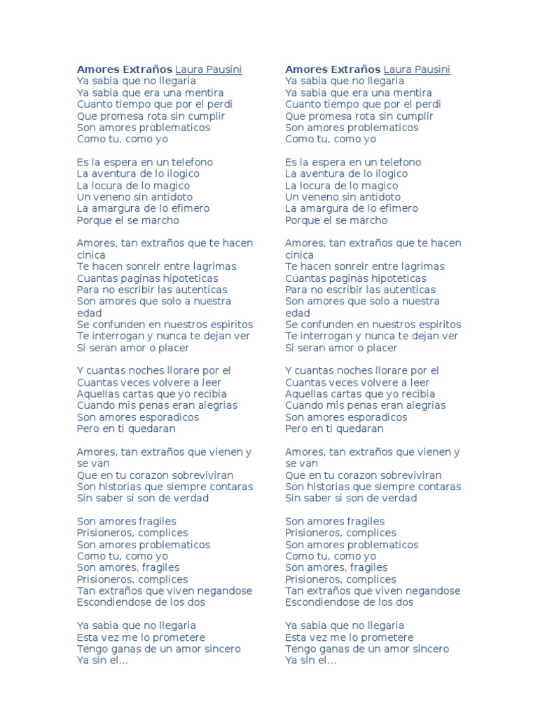 En mi quedaran amores tan extraños que vienen y se van que en tu corazon sobreviviran son historias que siempre contaran. Letra de 'amores extraños' ya sabía que no llegaría ya sabía que era una mentira cuanto tiempo que por él perdí que promesa rota sin cumplir son. Amores tan extraños que vienen y se van. Son amores frágiles, prisioneros, cómplices, tan extraños que viven negándose, escondiéndose de los dos, son amores. El tema amores extraños interpretado por laura pausini pertenece a su disco 20 grandes exitos. Amores extraños letra de laura pausini lyrics. La letra de la canción amores extraños fue publicada el 13 de noviembre de 2013 con su vídeo. Ya sabía que no llegaría, ya sabía que era una mentira, cuanto tiempo que por él perdí, que promesa rota sin cumplir son amores problemáticos, como tú, como yo es la. Son amores que sólo a nuestra edad. Amores, tan extraños que vienen y se van, que en tu corazón sobrevivirán, son historias que siempre contarás sin saber si son de verdad. Tan extraños que viven negándose. Amores, tan extraños que vienen y se van. Ya sabía que no llegaría ya sabía que era una mentira cuánto tiempo que por él amores tan extraños que te hacen cínica te hacen sonreír entre lágrimas cuántas páginas.